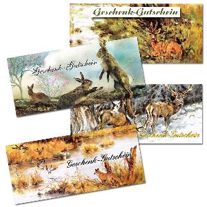 Und diese 8 Geschenkgutscheine haben wirklich außergewöhnlich schöne Motive nach Gemälden der bekannten Jagdmaler Hannes Liederley und Pál Csergezán: