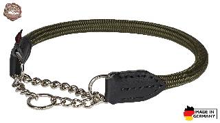 Die olivgrüne Halsung Landlord wird in Handarbeit aus rundem, im Durchmesser 11 mm starken Liros Safe Pro Halbstatikseil gefertigt. Dieses Seil stammt aus der Industrieklettertechnik und besitzt eine Bruchlast von 2850 kg bei einer Dehnung von 4,2 % . Das Safe Pro Seil ist witterungsbeständig und abwaschbar. Zur optimalen Haltbarkeit werden alle Nähte mit Handnaht gefertigt.