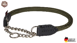 Die olivgrüne Halsung Landlord wird in Handarbeit aus rundem, im Durchmesser 11 mm starken Liros Safe Pro Halbstatikseil gefertigt. Dieses Seil stammt aus der Industrieklettertechnik und besitzt eine Bruchlast von 2850 kg bei einer Dehnung von 4,2 % . Das Safe Pro Seil ist witterungsbeständig und abwaschbar. Zur optimalen Haltbarkeit werden alle Nähte mit Handnaht gefertigt.