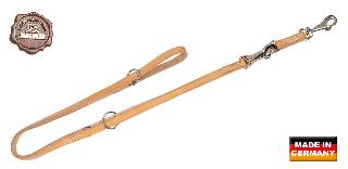 Diese Polizeileine besteht aus vegetabil (also rein pflanzlich) gegerbtem Fahlleder mit einem Fettgehalt von etwa 18 %. Für die Fettung werden ausschließlich hochwertige  Fette verwendet. Dadurch ist die Leine sehr elastisch, allergikerfreundlich und reißfest zugleich. Sie eignet sich sowohl zum Umhängen als auch zum Führen von zwei Hunden. Weiterhin sind alle Nähte, die einer Zugkraft ausgesetzt sind, von Hand genäht. Dies macht die Leine zu einem hochwertigen und sehr haltbaren Unikat.