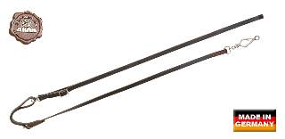Die dunkelbraune längenverstellbare Umhängeleine aus ökologisch gegerbtem Vollrindleder ist sehr reißfest und geschmeidig und liegt gut in der Hand.