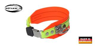 Die Schweißhalsung TRACKER verfügt über einen praktischen Steckverschluss. Leuchtend orange und neongelbes BioThane® Material sorgen für eine optimale Sichtbarkeit. Die extra breite Halsung von 50 mm verhindert ein Zusammenziehen und Würgen am Hundehals bei Zug. Ein stabiler Drehwirbel ermöglicht ein schnelles Schnallen des Hundes.  Der Steckverschluss hat eine Öffnungssperre - schnell zu öffnen und sicher zu verschließen.