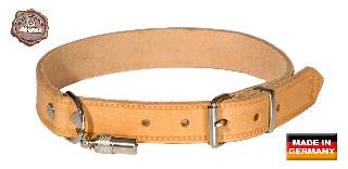 Das längenverstellbare Halsband aus vegetabil (pflanzlich) gegerbtem Fahlleder ist genietet und bietet ein optimales Preis-Leistungsverhältnis.