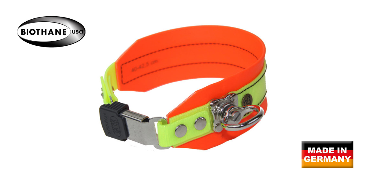 Die Schweißhalsung TRACKER verfügt über einen praktischen Steckverschluss. Leuchtend orange und neongelbes BioThane® Material sorgen für eine optimale Sichtbarkeit. Die extra breite Halsung von 50 mm verhindert ein Zusammenziehen und Würgen am Hundehals bei Zug. Ein stabiler Drehwirbel ermöglicht ein schnelles Schnallen des Hundes.  Der Steckverschluss hat eine Öffnungssperre - schnell zu öffnen und sicher zu verschließen.