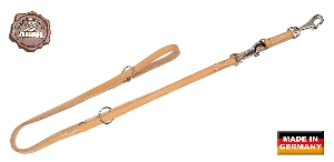 Diese Polizeileine besteht aus vegetabil (also rein pflanzlich) gegerbtem Fahlleder mit einem Fettgehalt von etwa 18 %. Für die Fettung werden ausschließlich hochwertige  Fette verwendet. Dadurch ist die Leine sehr elastisch, allergikerfreundlich und reißfest zugleich. Sie eignet sich sowohl zum Umhängen als auch zum Führen von zwei Hunden. Weiterhin sind alle Nähte, die einer Zugkraft ausgesetzt sind, von Hand genäht. Dies macht die Leine zu einem hochwertigen und sehr haltbaren Unikat.