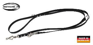 Diese schwarze Polizeileine aus BioThane® eignet sich als Umhänge- und Führleine. Sie ist auf vier Längen verstellbar, genietet und mit stabilen Bolzenhaken und einer Scherenzange versehen.
