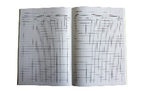 Mit Vordruck und Einteilung. Seite mit 4 Spalten à 5 Schuß / 24 Zeilen pro Seite. Geheftet, mit grünem Kartonumschlag.