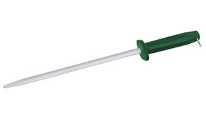 Für ein spielend einfaches Messerschärfen. Ausführung gehärtet und hartverchromt mit Aufhängering am Griff. Der grüne, stabile Griff gewährleistet eine optimale Handhabung für Rechts- und Linkshänder.