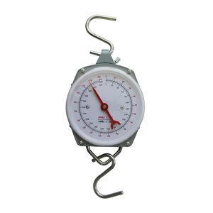 Genaue Gewichtsanzeige über Zeiger. Mit Edelstahlhaken. Abgedeckt mit Kunststoff-Schutzscheibe.