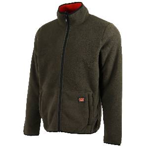 Jacke aus grünem Fleece und orangem Faserpelz. 2 Taschen mit Reißverschluss auf der Fleeceseite und 2 Taschen mit Druckknopf auf der Faserpelzseite.